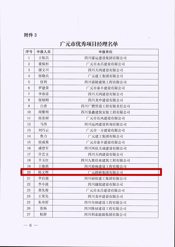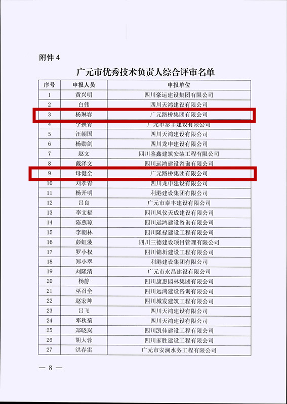 2023年7月1日,廣元路橋集團有限公司被廣元市住房和城鄉(xiāng)建設(shè)局評為優(yōu)秀建筑企業(yè);陳文輝被評為“廣元市優(yōu)秀項目經(jīng)理”;母健全、楊琳容被評為“廣元市優(yōu)秀技術(shù)負(fù)責(zé)人”。